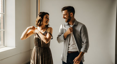 A happy young couple laughs while getting dressed together in a bright, minimalist room with a white background. The man buttons a grey shirt while the woman adjusts the strap of her patterned dress, capturing a candid and joyful moment of partnership. This image represents themes of love, morning routines, and getting ready for the day.