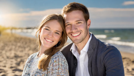 A vibrant photo capturing a beautiful young couple on a warm summer day, smiling joyfully while spending time together at the beach. The image radiates love, relaxation, and sunny coastal vibes.
