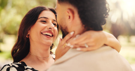 Hug, romance and couple on date, outdoor and love for people in nature, laughing and smile on anniversary. Park, woman and affection for man, happy and together for valentines day, care or commitment