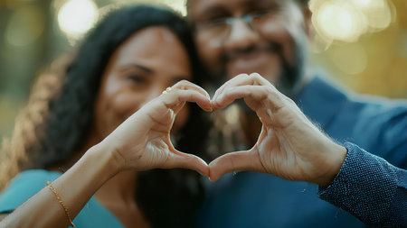 Happy couple forming a heart shape with their hands. Man and woman creating a heart symbol with their hands.