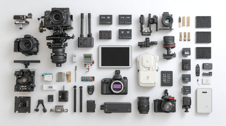 An extensive display of various camera equipment and accessories arranged on a dark surface, ideal for photography and videography projects, showcasing intricate details.