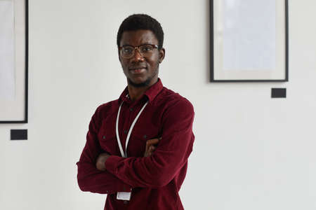 Waist up portrait of young African-American man looking at camera with arms crossed while working at art gallery or exhibition, copy space