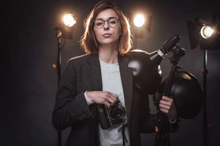 Studio portrait of positive blond female with photo camera with photo equipment on background.