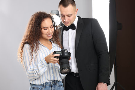 Photographer discussing with art coordinator. Man with camera communicate with photoshoot director during the studio session. Production of commercials backstage