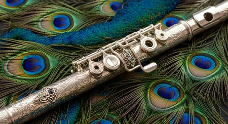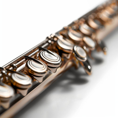 A detailed close-up shot of a flute showcases its intricate keys, pads, and polished body under warm, elegant lighting. The image highlights the craftsmanship of the musical instrument and evokes concepts of classical music, melody, and artistic performance.