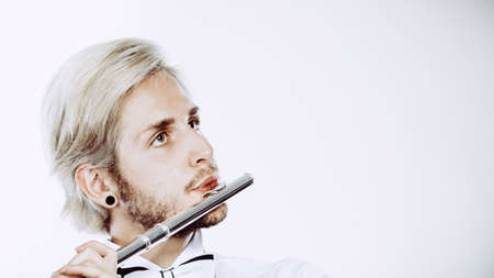 Flute music playing professional male flutist musician performer. Young elegant stylish man with instrument