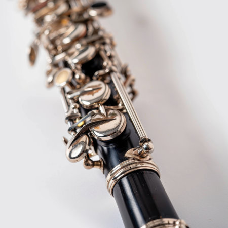 This close-up image highlights a beautifully crafted silver clarinet, focusing on the intricate details of keys and mechanisms, perfect for showcasing music artistry.