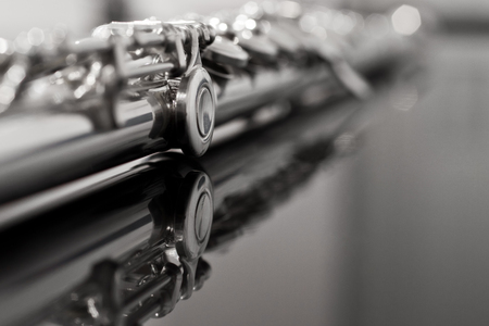 a detail of silver concert flute with a focus on the first key