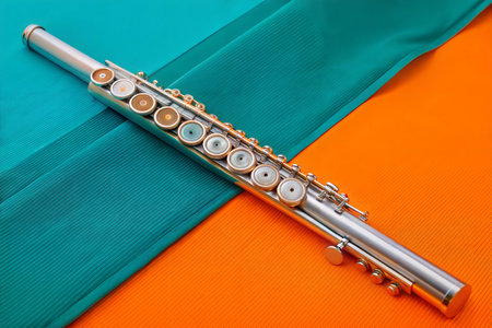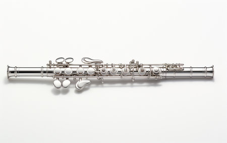 This image captures a close-up view of a silver flute, showcasing its elegant keys and fine details, perfect for music-related projects and artistic expressions.