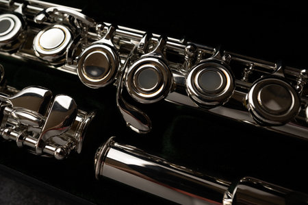 Detail of a Western concert flute, black background