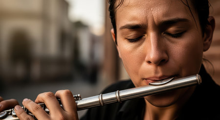 Young caucasian female flautist performing intently outdoors