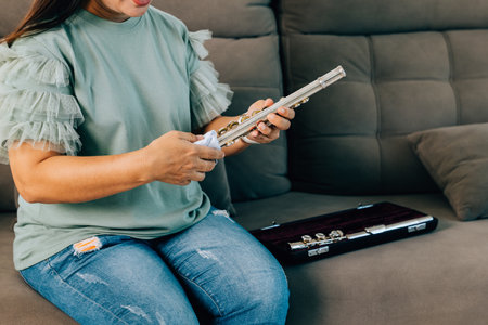 A female flutist sits on a brown couch at home, carefully wiping her silver flute with a soft cloth. The living room setting reflects her dedication to maintaining her musical instrument.