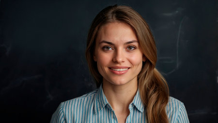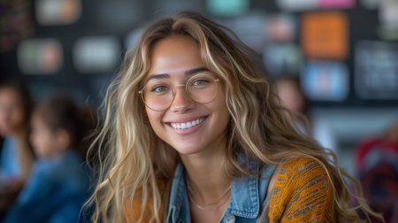 Inspiring and Beautiful Female Teacher with a Captivating Smile in a Warmly Lit Classroom Setting