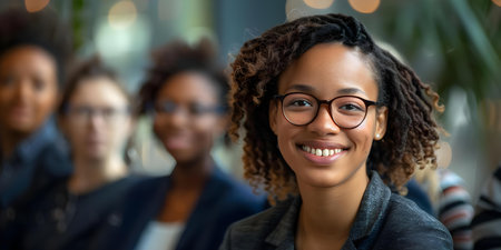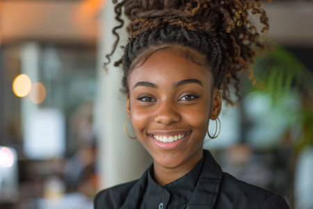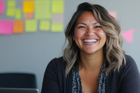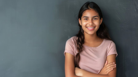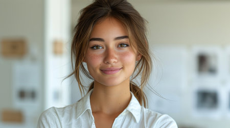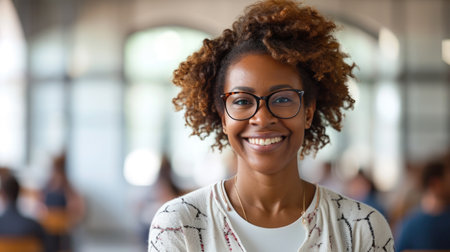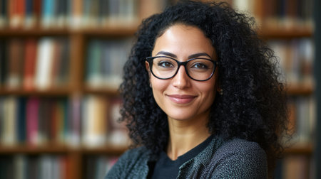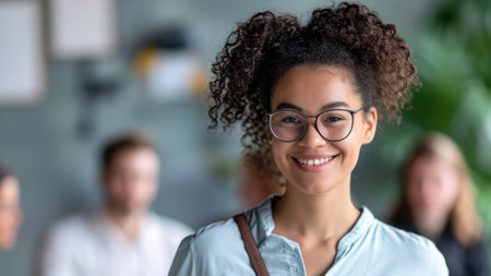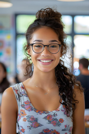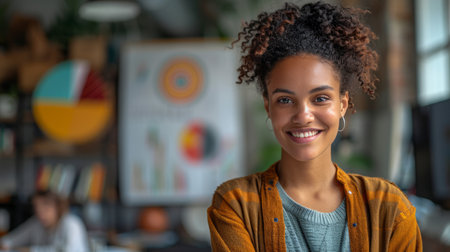 A cheerful young mixed-race woman poses confidently in an educational workspace. Concept Portrait, Confident, Young, Mixed Race, Educational Workspace