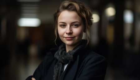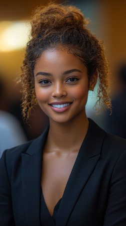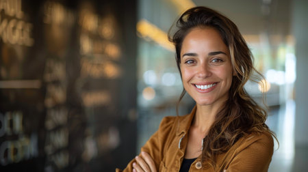 A close-up portrait of a professional woman dressed in business attire, radiating confidence, positivity, and leadership qualities. Suitable for themes of empowerment, career growth, and modern work environments.
