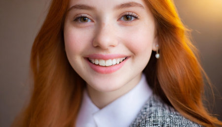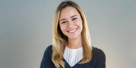 A captivating portrait of a smiling young woman with silky, blonde, and beautifully styled long hair, set against a gentle pastel flat backdrop, reflecting confidence, elegance, and natural