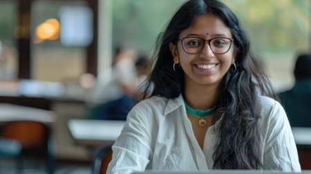 Portrait of a beautiful, young and intelligent-looking Indian Asian woman student wearing a white shirt and green tracker smiling as she works on her laptop