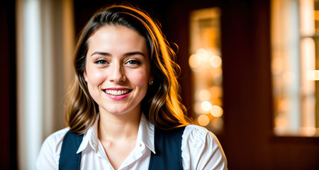Portrait of Smiling female manager standing in hotel. A happy businesswoman in a hotel.