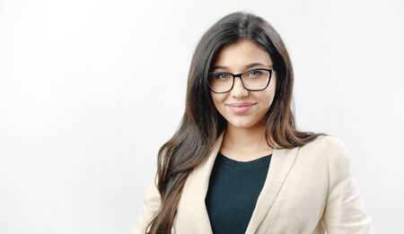 Portrait of smiling young dark haired woman wearing spectacles isolated on white background looking at camera