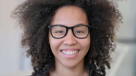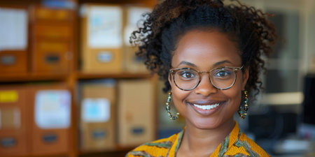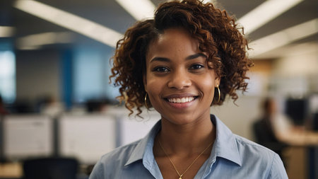 Confident African American Woman Smiling in Modern Office Environment During Work Hours