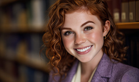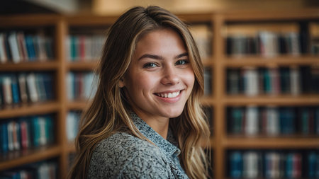 Young woman smiling warmly in a library filled with books during a bright afternoon.