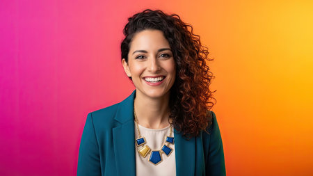 A woman with curly hair smiles brightly, her expression radiating positivity. She wears a blue jacket and a necklace, set against a colorful gradient background. The image has a studio portrait style with bright lighting, suitable for various editorial and commercial applications. The composition emphasizes the subject's face.