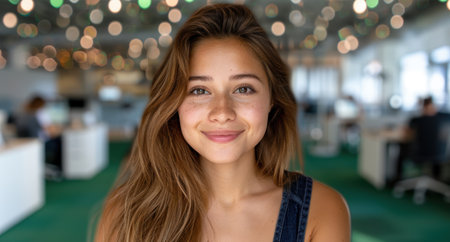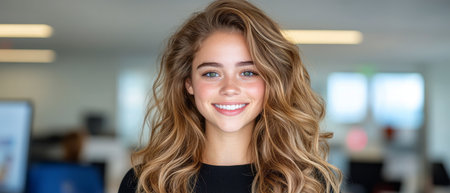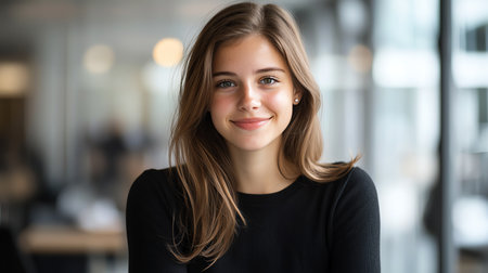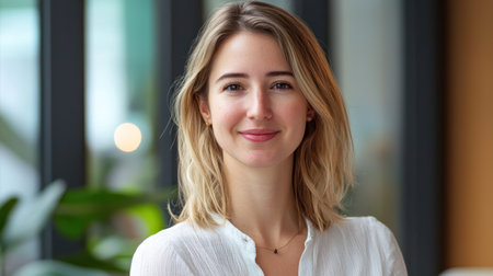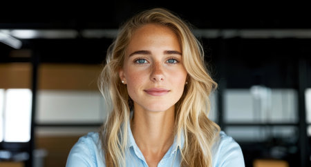 A young woman with blonde hair smiles warmly in modern office setting, showcasing professional atmosphere