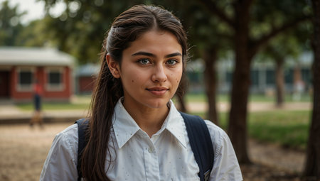 Happy student stands outdoors, enjoying the day with a backpack and warm smile in a school setting.