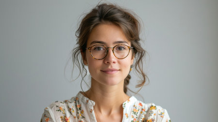 Portrait of a beautiful young woman with long brown hair and glasses looking at the camera.