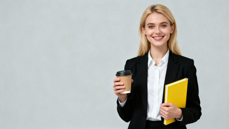 Portrait of a young businesswoman holding a coffee cup and a yellow folder