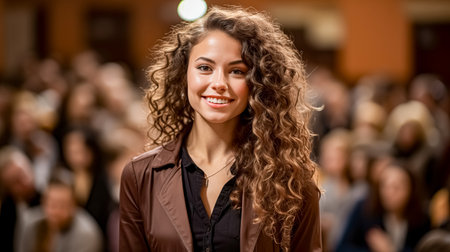 Portrait of a beautiful young woman with long curly hair in the conference hall.