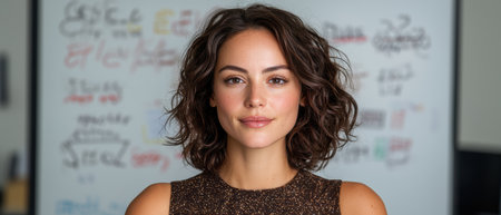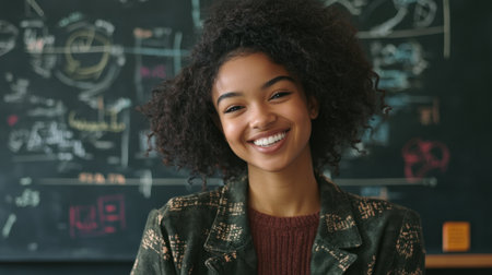 Smiling young woman stands confidently in front of a chalkboard filled with complex mathematical equations and diagrams, radiating intelligence.