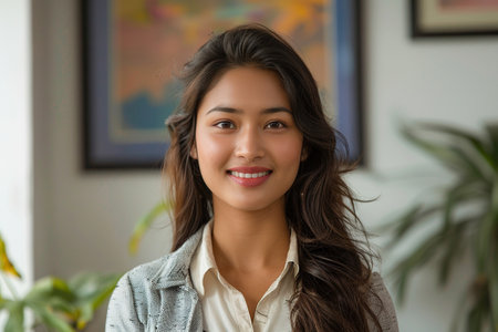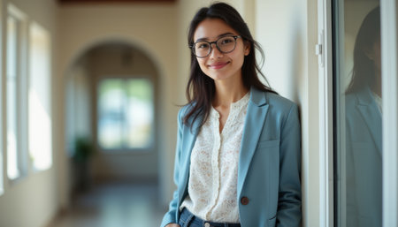 A poised young woman with long dark hair stands confidently in a chic blazer, radiating warmth and professionalism. The soft natural light streaming through the windows enhances her inviting smile, creating an atmosphere of positivity and ambition.
