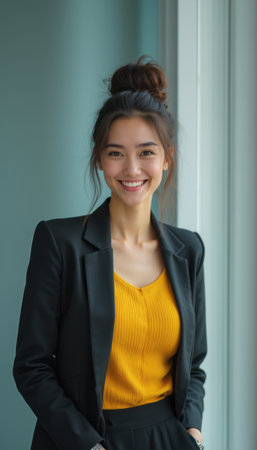 A radiant young woman stands confidently by a window, dressed in a chic black suit paired with a bright yellow top. Her warm smile and relaxed hairstyle exude professionalism and approachability, making her a perfect representation of modern elegance and empowerment