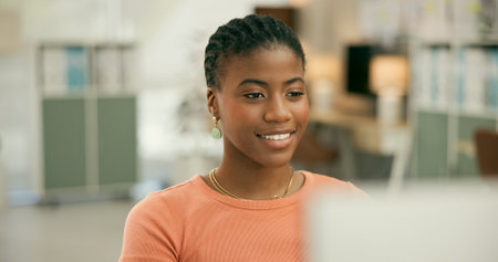 Smile, business or black woman with computer in office for news, email or post online. Digital agency, tech startup or happy African employee with PC software typing or planning for research
