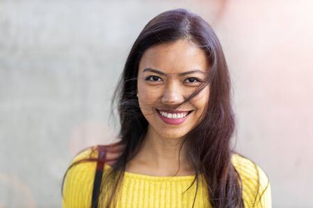Portrait of a Smiling Young Woman in a Bright Yellow Coat Outdoors. Concept Outdoor Photoshoot, Joyful Portraits, Colorful Props