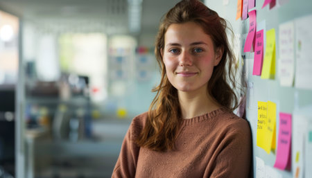 A woman stands in an office environment with a relaxed pose. She has a smile on her face and looks confident. Many workstations are visible in the background.