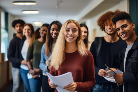 A group of happy students stands closely together their smiling faces brightening the school corridor during a busy day.