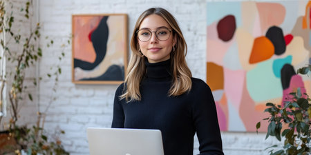 Confident Young Woman Presenting Laptop With Abstract Art At Modern Studio In Natural Light