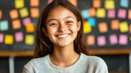 Cheerful Ethnic School Girl Smiling Surrounded By Colorful Sticky Notes In A Bright Classroom