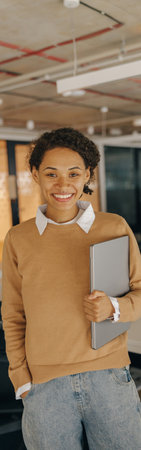 Portrait of a smiling African American businesswoman standing in a modern office with computers and large windows, providing ample copy space for text or banner