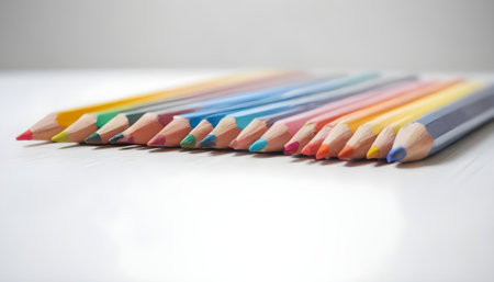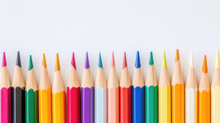A neat arrangement of colored pencils on a clean white background, with vibrant hues displayed in perfect harmony, ideal for creative projects
