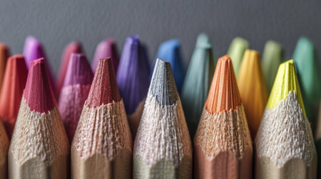 Soft gray pencil strokes create a gentle gradient, highlighting the intricate texture and rich colors of the pencil tips. The arrangement invites exploration and artistic expression.