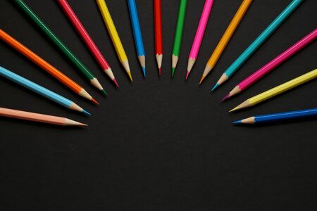 Top view of colored pencils arranged in a semicircle in the form of rays on a dark background