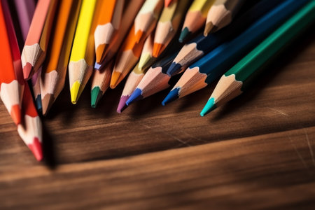 Group of colored pencils sitting on top of wooden table next to each other. Generative AI.