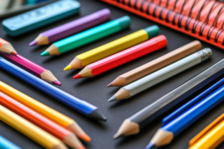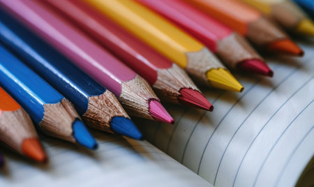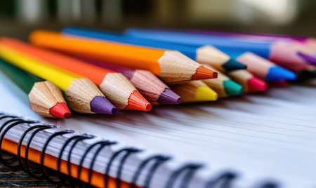 Colorful pencils on an open book, symbolizing creativity and education. Generate AI