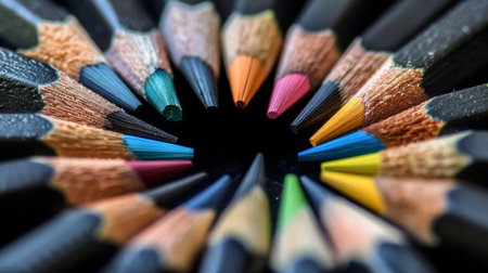 A collection of colored pencils, each a different hue, carefully arranged in a circular formation. The pencils are neatly aligned with their tips pointing towards the center, creating a visually striking pattern.