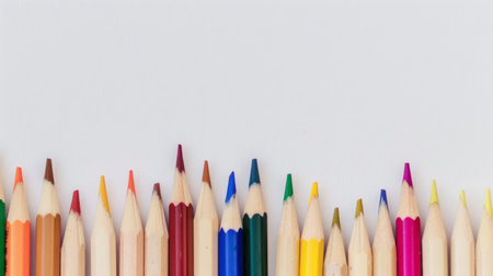 Bright white background with a row of colorful pencils, tips pointing upwards in perfect alignment