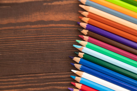 Multicolored pencils collection on wooden background. Row of colored pencils. Top view. Flat lay.