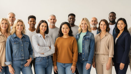 Diverse, smiling people in casual and business attire, studio.
